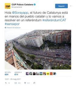 Ha estat la resposta de la CUP Nacional a través d'una piulada escrita en espanyol adreçada a Soraya Sáenz de Santamaría: "Hola @Sorayapp, el futuro de Catalunya está en manos del pueblo catalán y lo vamos a resolver en un referéndum #referèndumCAT #sensepor".