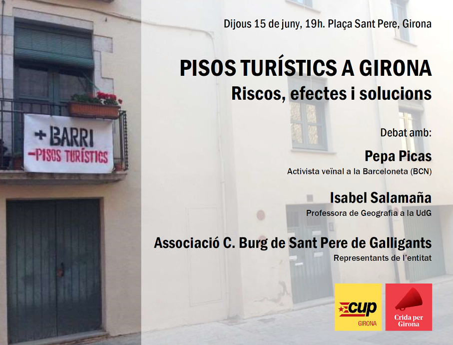 Debat ‘Pisos turístics a Girona: riscos, efectes i solucions’, el dijous 15 de juny, a les 19:00h, a la plaça Sant Pere, de Girona, amb la participació de Pepa Picas, activista veïnal a la Barceloneta; Isabel Salamaña, professora de Geografia a la UdG, i representants de l’entitat Associació Cultural Burg de Sant Pere de Galligants.