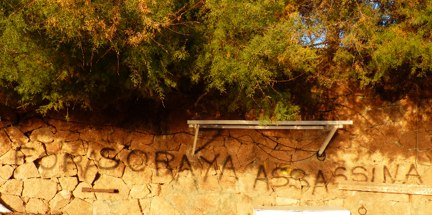 | Pintada feta a menys de 30 metres del mur de l’hotel S’Agaró Hotel amb el text “Fora Soraya Assassina" (Imatge: grup de whatsapp "Fora Soraya de S'Agaró"). |