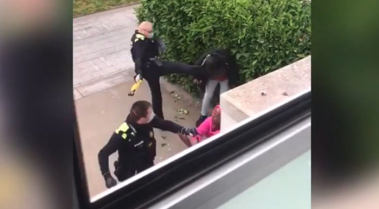 Ja dins del portal el policia l'agafa i el treu cap a fora mentre ell s'intentava escapolir. Aleshores va baixar del pis familiar el seu germà que va intentar evitar que els policies el tiressin a terra per arrestar-lo. En aquell moment, un dels agents va donar una puntada de peu al germà que va acabar caient a terra mentre l'apuntava amb una pistola elèctrica -l'Ajuntament va autoritzar-ne el seu ús fa pocs mesos-.