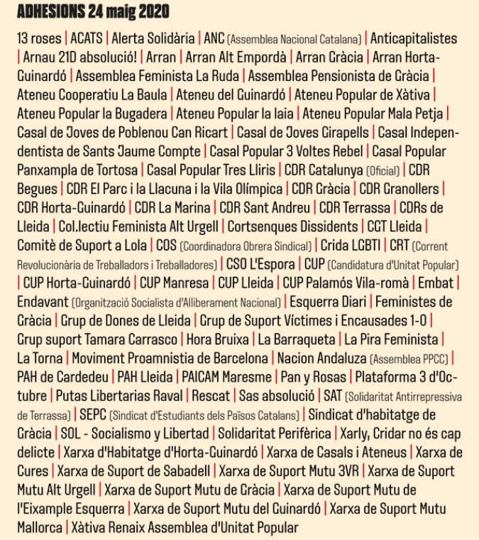 Des d'aleshores, s'han rebut un centenar d'adhesions al manifest (les d'Arran, Alerta Solidària, l'ANC, la CUP o el SEPC, entre tantes) i més d'una trentena de nuclis arreu del territori, des de València (l'Horta de València, País València) fins a la Seu d'Urgell (Alt Urgell, comtat d'Urgell), han fet públiques les seves convocatòries per repetir les concentracions avui i cada dimarts a les 20:00h.