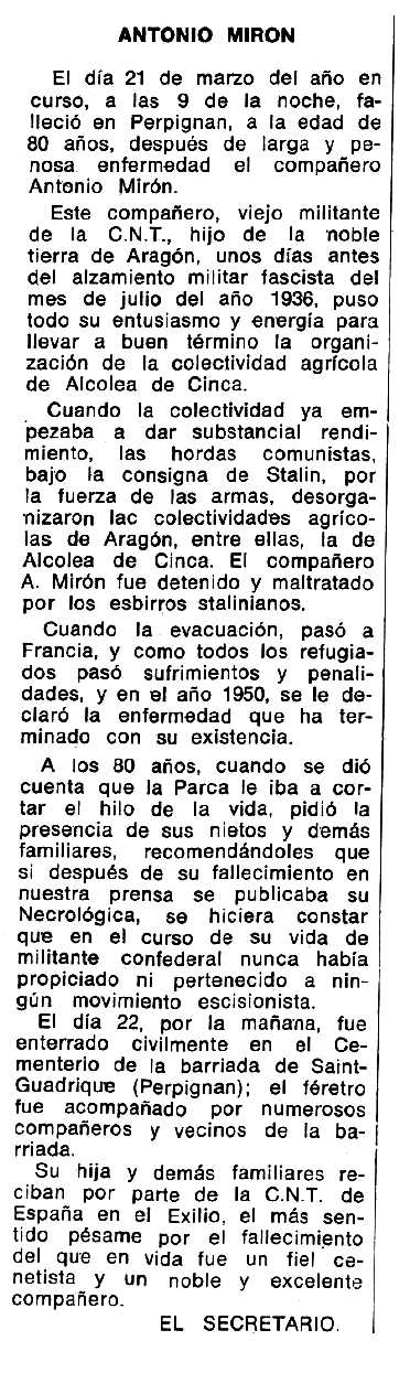 Necrològica d'Antonio Mirón Bosque apareguda en el periòdic tolosà Espoir del 3 d'agost de 1975