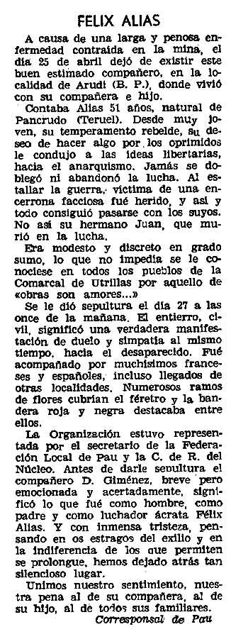 Necrològica de Félix Alias Escriche apareguda en el periòdic parisenc Solidaridad Obrera de l'11 de maig de 1961