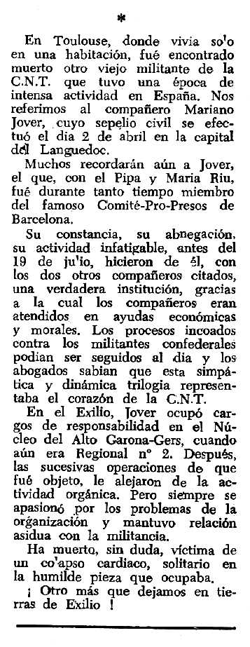 Necrològica de Mariano Jover Ferrando apareguda en el periòdic tolosà Espoir del 12 d'abril de 1964