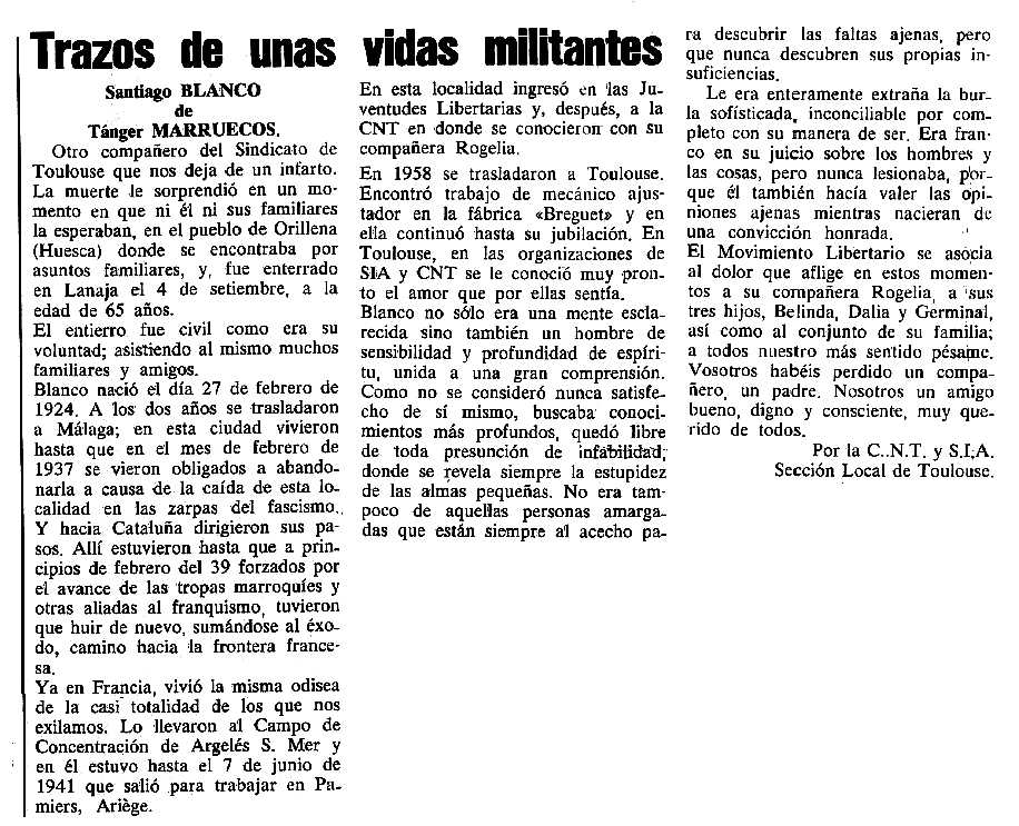 Necrològica de Santiago Blanco Díaz apareguda en el periòdic tolosà Cenit del 9 de gener de 1990