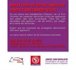 El 17 de setembre de 2020, dues treballadores de l'escorxador Esfosa, a Vic, van presentar una denúncia per assetjaments sexuals contra un encarregat de l'empresa de neteja d'aquest escorxador. Malgrat que l'agressor va ser acomiadat, hi ha hagut i hi ha encara represàlies continuades. Aquest tema s'ha posat en coneixement de les dues empreses: Esfosa (principal) i GCT Plus (neteja).